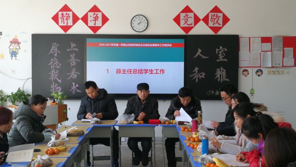 會議主要分為三個環(huán)節(jié):首先薛主任做了20—21年第一學期班主任工作情況總結(jié)發(fā)言。分別對班主任管理日常工作和參與學校活動取得的成績作出總結(jié),對班主任管理短板之處提出改進的意見,要求班主任要高度重視學生安全問題,對疫情期間學生出勤加強管理。最后薛主任對班主任的辛苦付出表示感謝并提出新的希望。