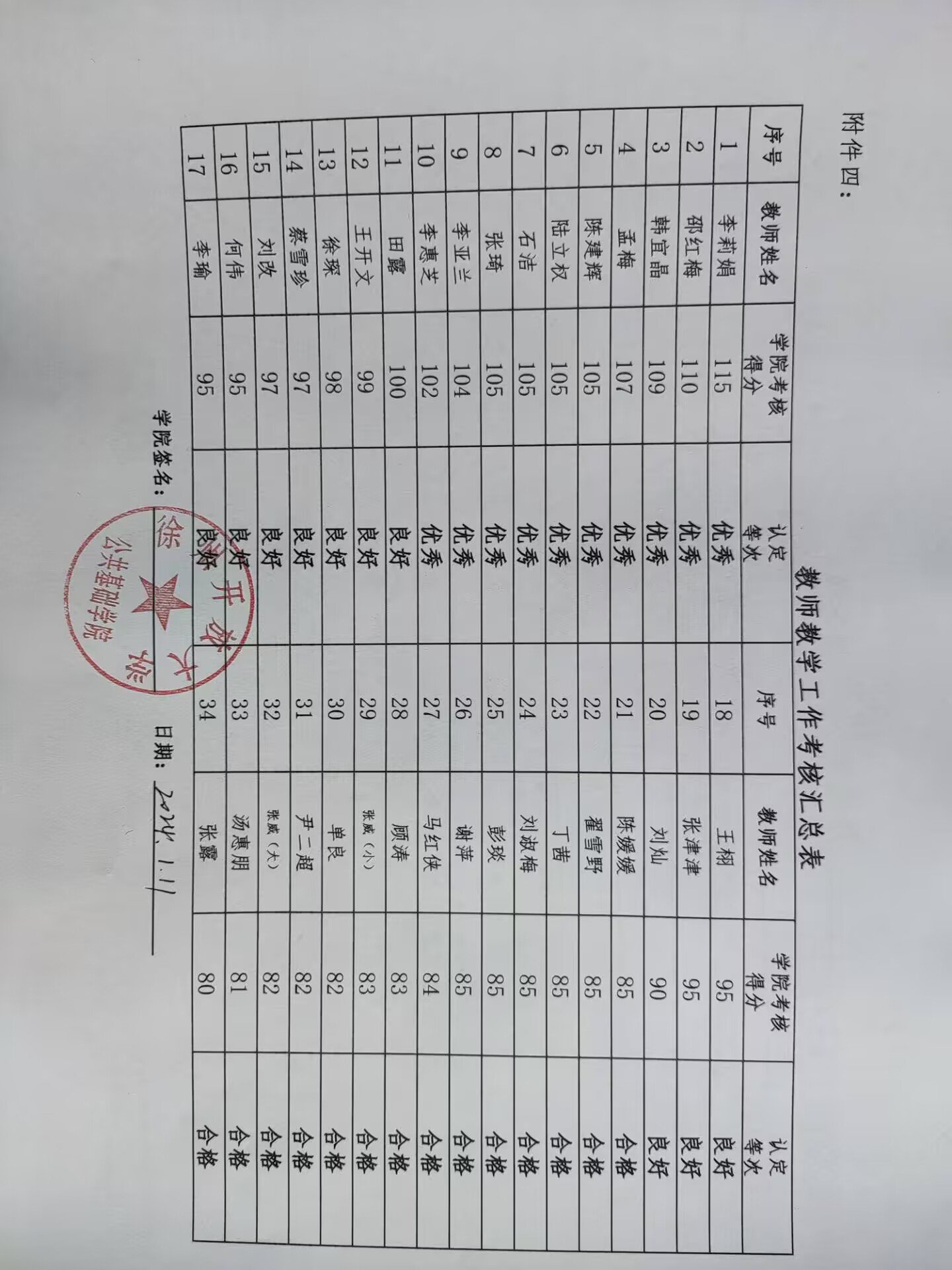 依據(jù)我校關(guān)于任課教師教學(xué)工作考核通知的相關(guān)精神,我院學(xué)院成立考核小組,按照學(xué)校考核要求,對(duì)該學(xué)院任課教師進(jìn)行考核?,F(xiàn)將考核結(jié)果公示如下: