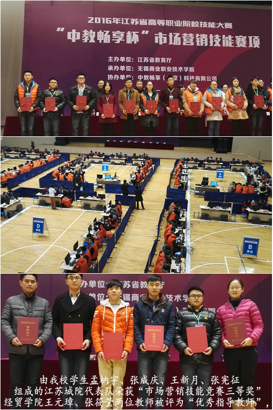 1月8至9日,2016年江蘇省高等職業(yè)院校技能大賽“市場營銷技能” 賽項在無錫商業(yè)職業(yè)技術(shù)學院舉行。該賽項由我校經(jīng)貿(mào)學院師生代表江蘇城市職業(yè)學院參賽,學生孟枘宇、張成慶、王新月、張憲征經(jīng)過兩天的激烈角逐,獲得“市場營銷技能競賽三等獎”的佳績,指導老師張筱瑩、王元璋被評為“優(yōu)秀指導教師”,這也是我校在沒有軟件的情況下連續(xù)三次獲此殊榮。