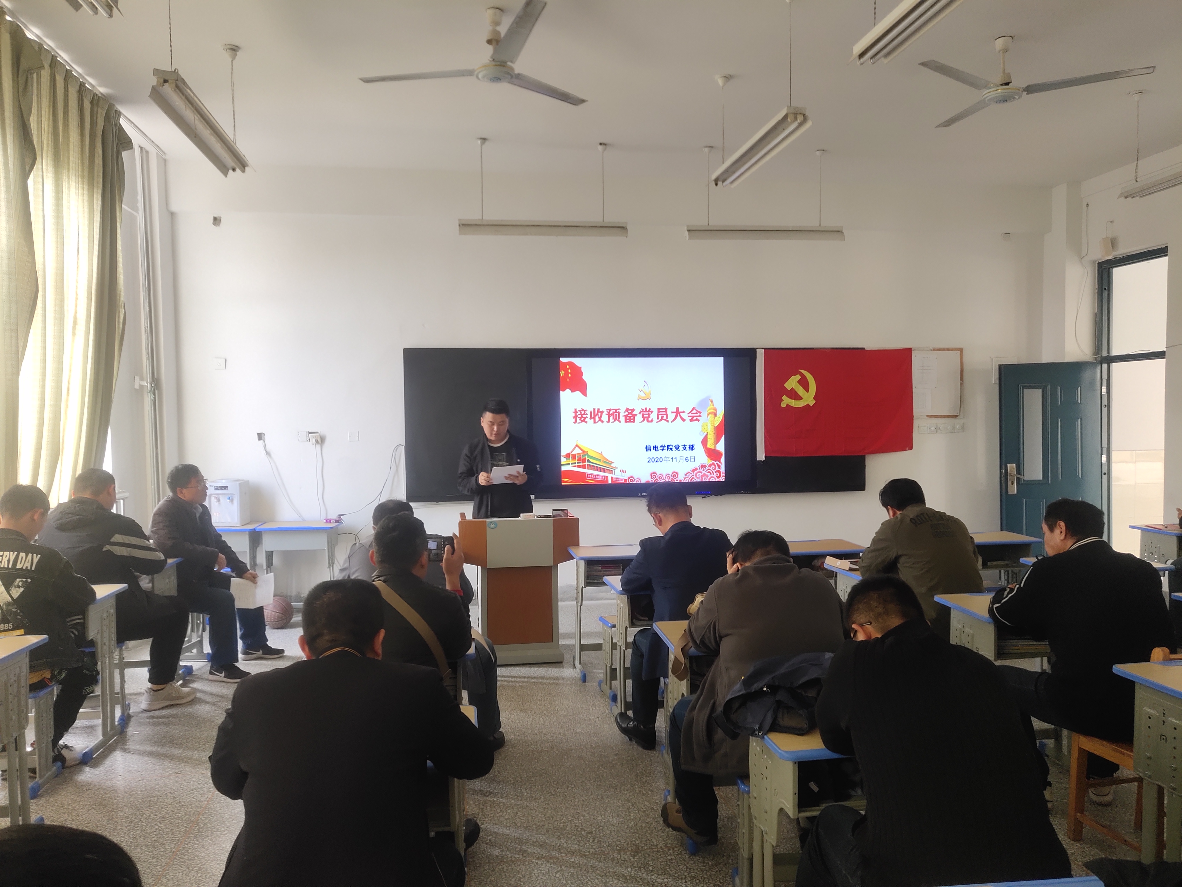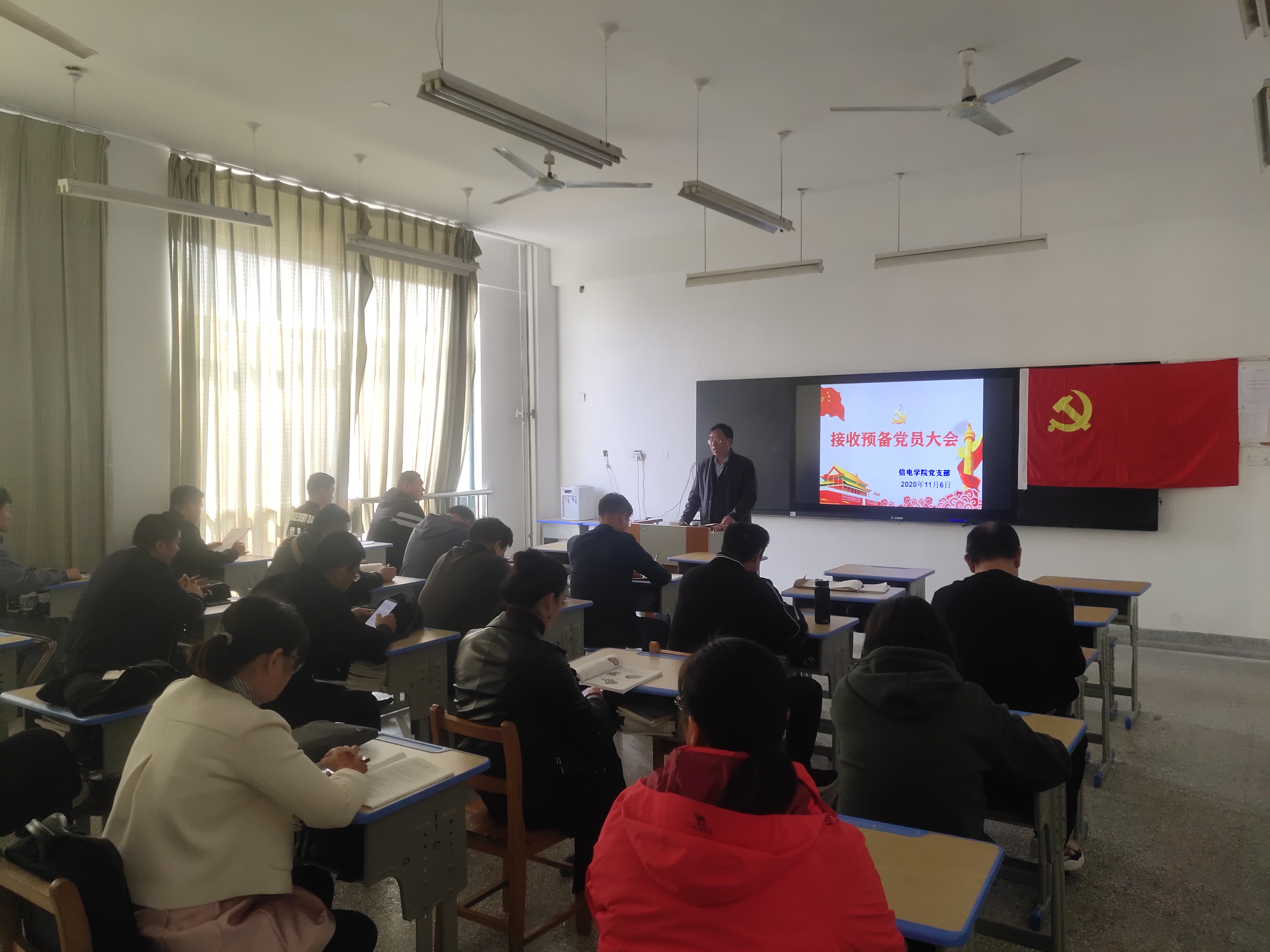 2020年11月6日下午,信電學(xué)院黨支部在中職校區(qū)教學(xué)樓405室召開發(fā)展新黨員大會(huì),信電學(xué)院黨支部全體黨員、學(xué)生預(yù)備黨員、發(fā)展對(duì)象共27人參加了會(huì)議,會(huì)議由黨支部書記王干永同志主持。