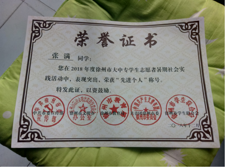 2019年4月25日,我院小水滴志愿者服務(wù)隊(duì)在2018年度徐州市大中專學(xué)生志愿者暑期社會實(shí)踐活動中,表現(xiàn)突出,榮獲“優(yōu)秀團(tuán)隊(duì)”稱號。小水滴志愿者張滿同學(xué)榮獲“先進(jìn)個(gè)人”稱號。