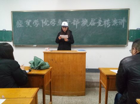 2016年11月22日18:30,迎著2016年的第一場雪,經(jīng)貿(mào)學院在教學樓406教室舉行了學生干部換屆競聘演講大會,本次換屆大會由現(xiàn)任團總支書記蔣婭歆主持召開,出席本次大會的有經(jīng)貿(mào)學院鮑書記和學生會主席團代表以及所有學生會成員和參加競選的同學。
